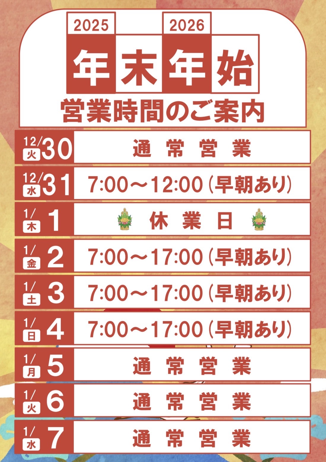 (2日〜4日は早朝7:00〜17:00までの営業となります)